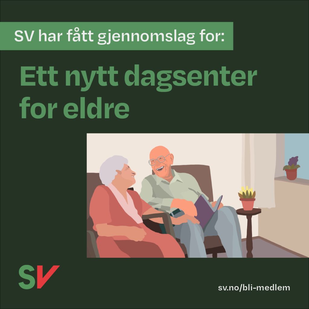 I den andre enden av skalaen tar vi to svært viktige grep for dei eldre i kommunen vår. Vi set av pengar til eit nytt dagsenter. Dagsenter for heimebuande eldre gjev tilbod som skal forebygge sosial isolasjon, einsemd og funksjonstap av ulike årsaker. Formålet er å hjelpe til med meistring, sosial støtte, aktivisering, ernæring og auka livskvalitet. Dagsenter er eit av dei områda der vi har aller lengst venteliste i kommunen vår. Eit nytt dagsenter vil hjelpe mykje.